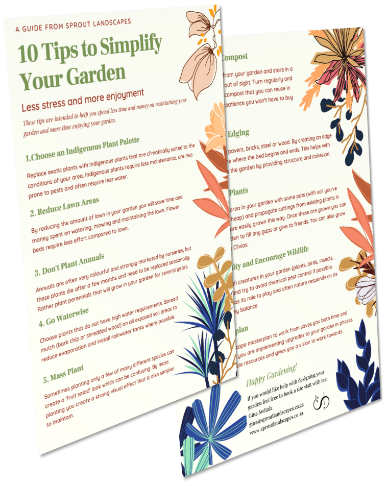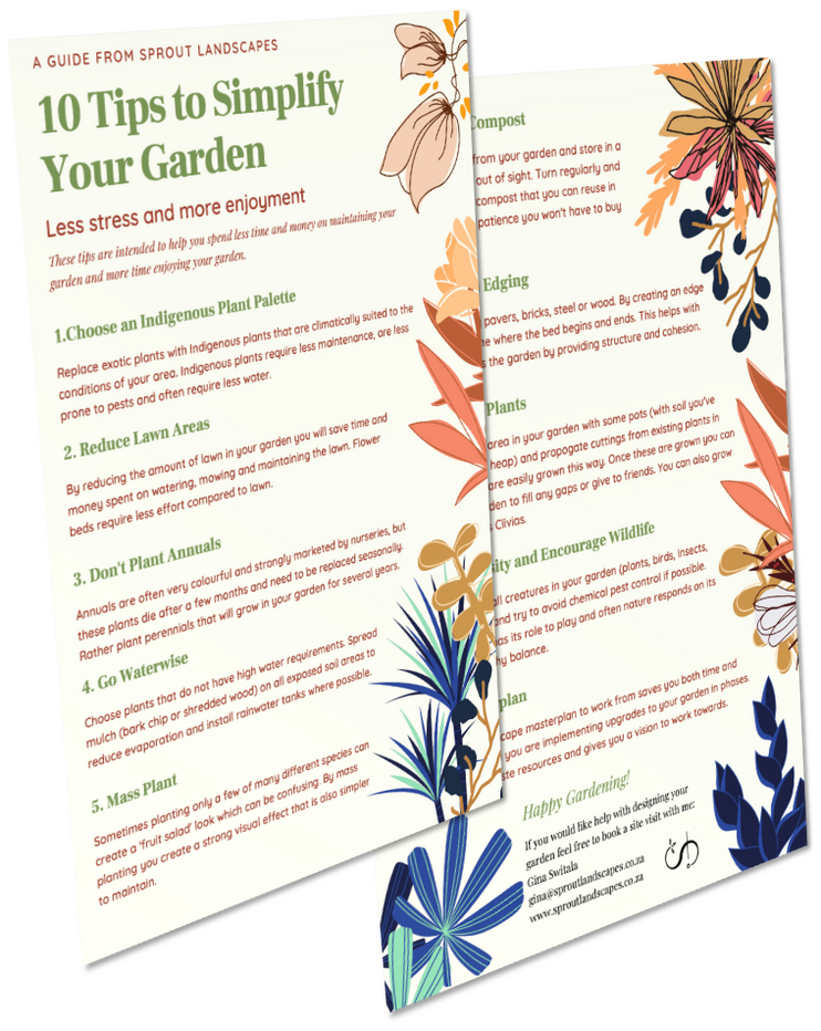 If you enjoyed this guide, I'd love it if you'd share it with your friends.I'm all about simplifying, so here's some text you can cut and paste, if you'd like:I just downloaded a free guide called "10 Tips to Simplify Your Garden" from Gina at Sprout Landscapes. It looks great and I'm looking forward to feeling less stressed and more joyful when I'm in my garden! If you're looking for the same thing, go to simplify.sproutlandscapes.co.za and get a copy for yourself.